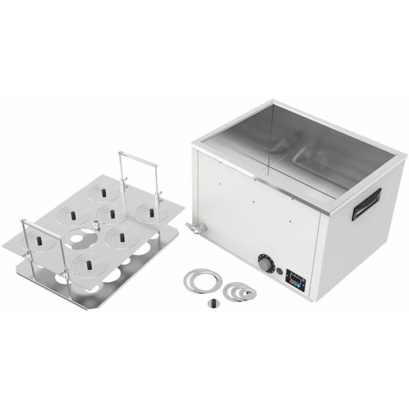- Система из 5‑ти стальных концентрических колец позволяет уплотнять размещенные в ванне колбы, стаканы и другую лабораторную посуду.