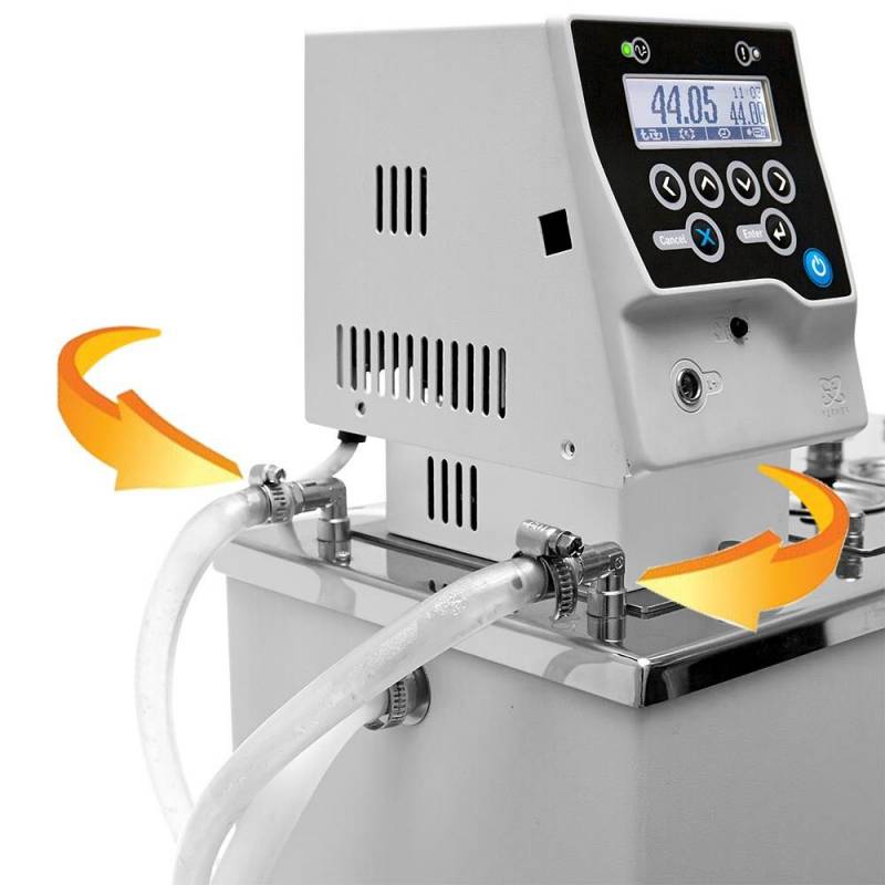 - Встроенный теплообменник для подключения к водопроводу или проточному охладителю позволяет устанавливать температуру регулирования ниже температуры окружающей среды.